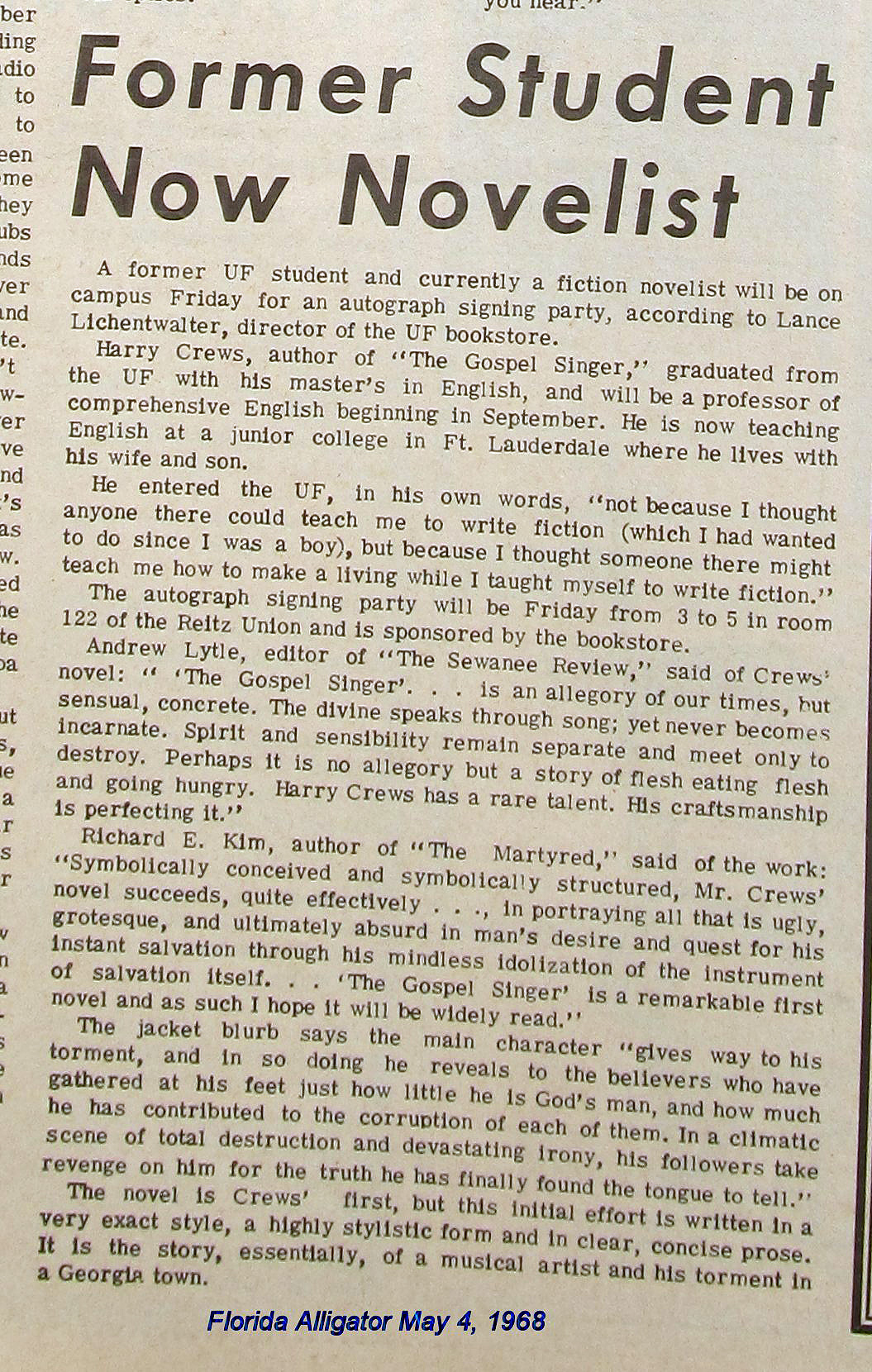 Harry Crews, author of The Gospel Singer, graduated from the UF with his master's in English, and will be a professor of comprehensive English beginning in September. He is now teaching English at a junior college in Ft. Lauderdale where he lives with his wife and son.